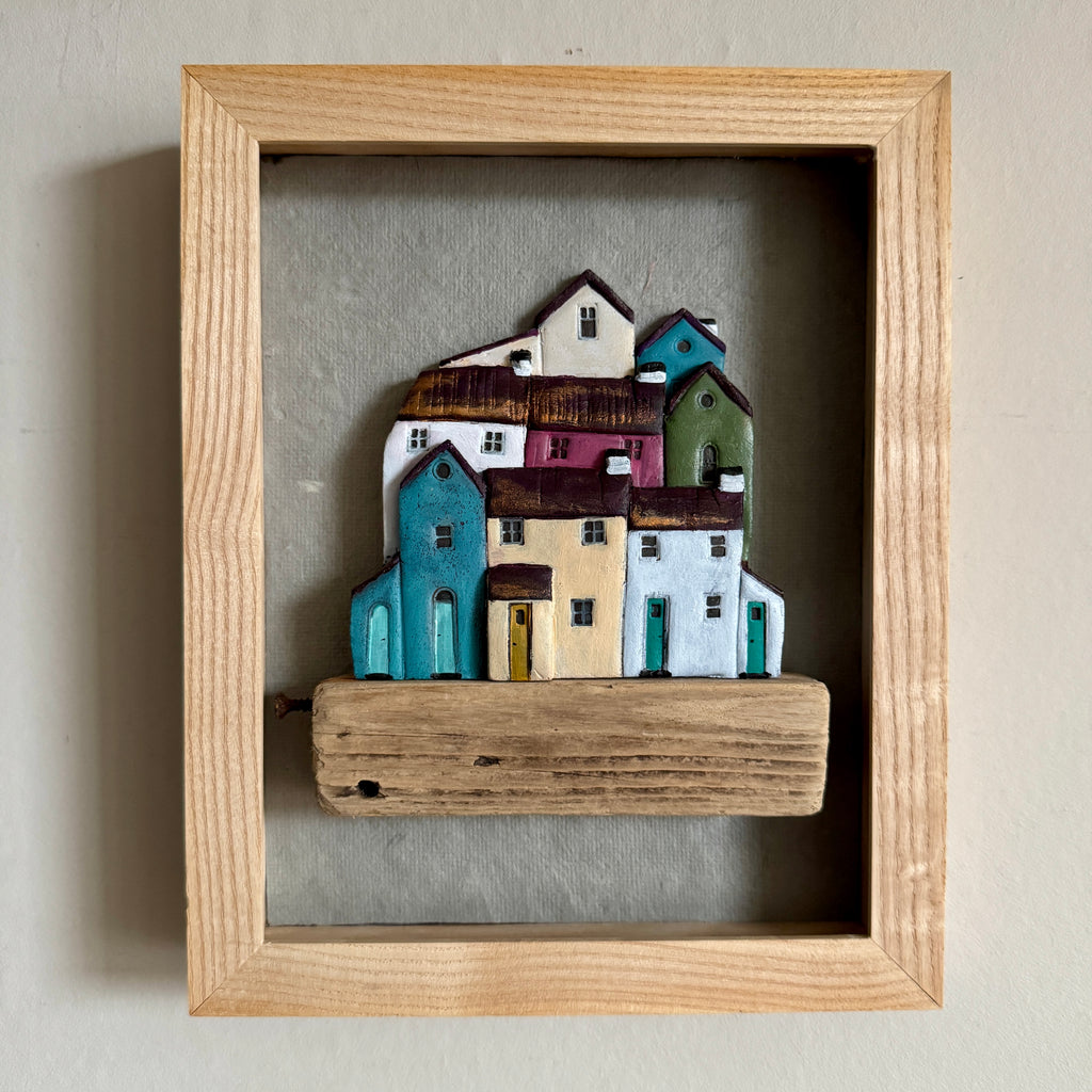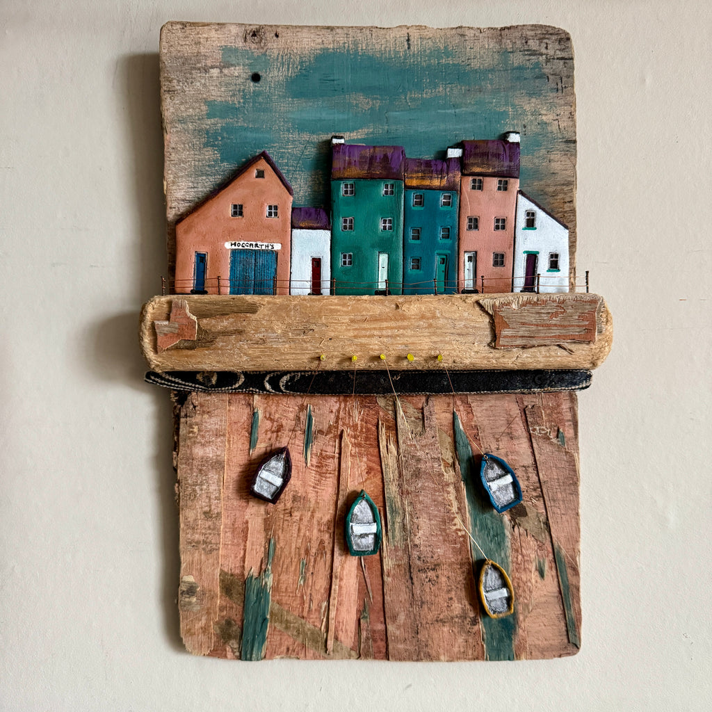 Being a collector of driftwood and found objects on my beach walks, I have an abundance interesting finds, i also have lots of scrap paper and board left over from producing prints etc. It is these waste products and fired clay that I use to produce the following artworks